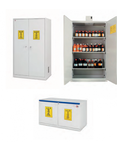 Armoires de sécurité de conception monobloc, dotées de points critiques de renforcement pour une robustesse optimale. Elles sont spécialement conçues sans support central afin de faciliter la manipulation interne des produits stockés. L’armoire est divisée en deux compartiments distincts : un pour les acides et un autre pour les bases, chacun équipé de serrures indépendantes pour une sécurité renforcée. Elle est également prédisposée pour l’intégration d’un système d’aspiration, sans nécessiter d’installation préalable. Les portes réversibles sont munies d’un verrouillage de sécurité garantissant une protection optimale des substances stockées.