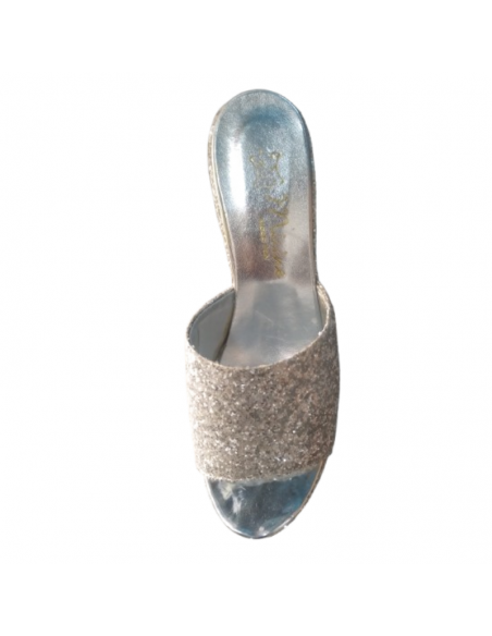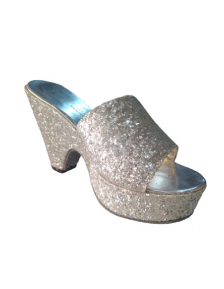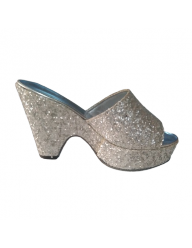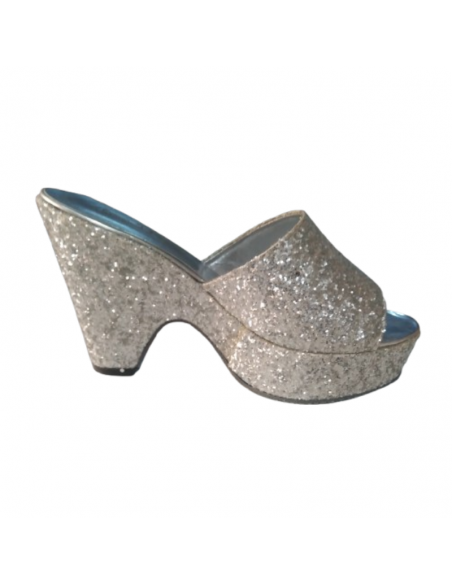Chaussure à talon compensé avec finition pailletée argentée, parfaite pour un look festif et audacieux.