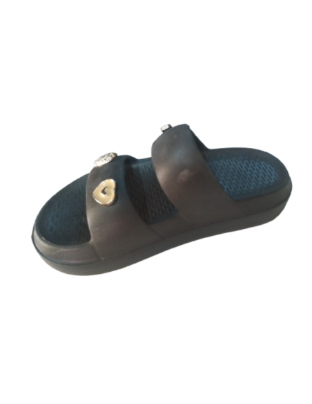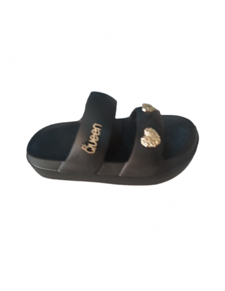 Claquettes femme – Noires avec nœud crème et bijoux dorés