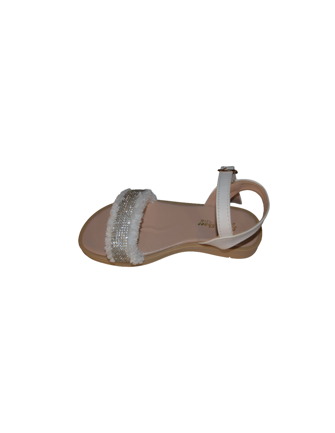 Sandales élégantes pour filles, en simili cuir blanc, avec une bride avant décorée de strass scintillants et de fourrure douce.