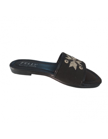 Sandale noire simple et élégante avec une broderie florale beige et des détails décoratifs, idéale pour un style décontracté chic.