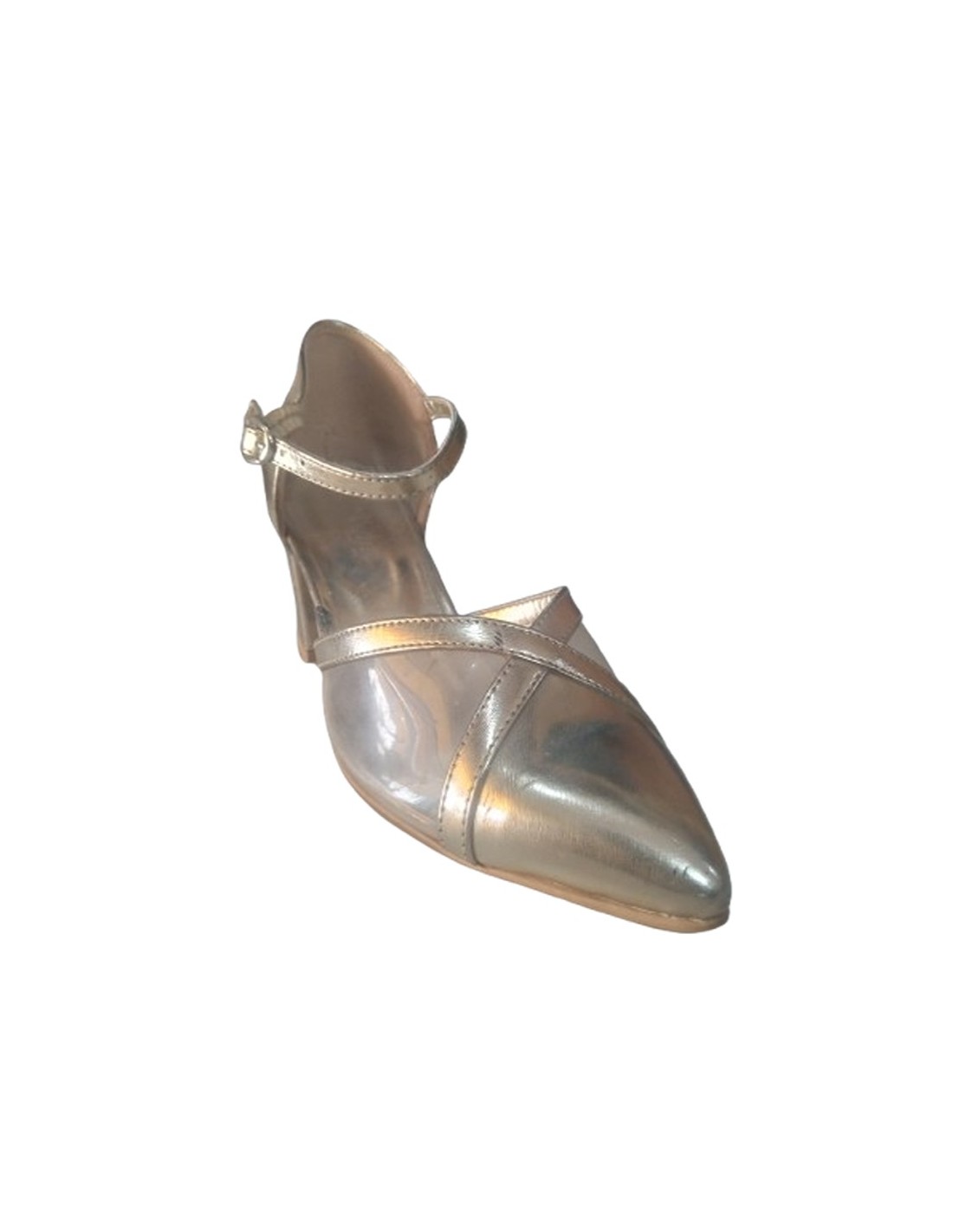 Escarpin ouverte sur les cotés avec une bride ajustable au niveau de la cheville, bout pointu et une partie transparente